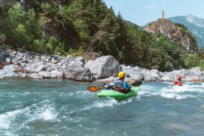 - alt=″deux personnes en kayak sont en train de descendre une rivière dans la vallée de l’Ubaye, entourées de forêts et de rochers″