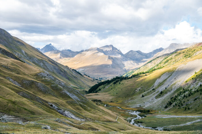 - alt=″vue du vallon du Lauzanier, dans le parc du Mercantour, un vaste paysage de montagnes traversé par un petit ruisseau sinueux″